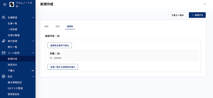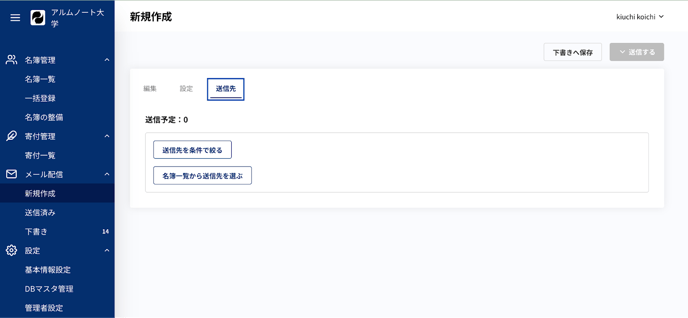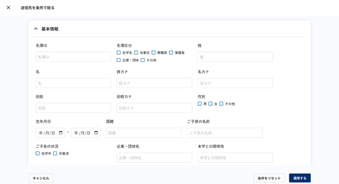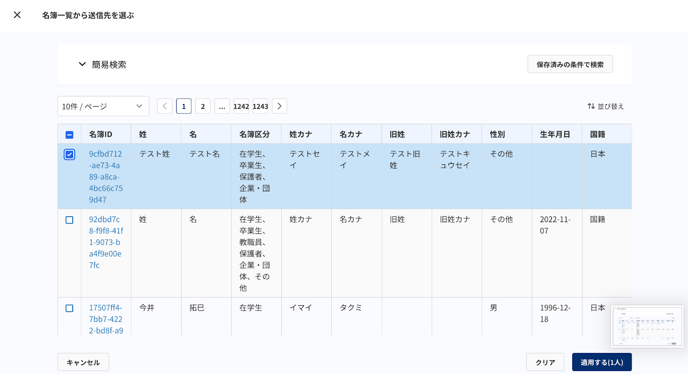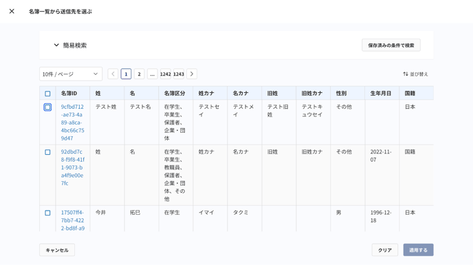• “適用する” ボタンを押すと、名簿に登録された方のうち、条件に一致した方のアドレスが送信先に指定される