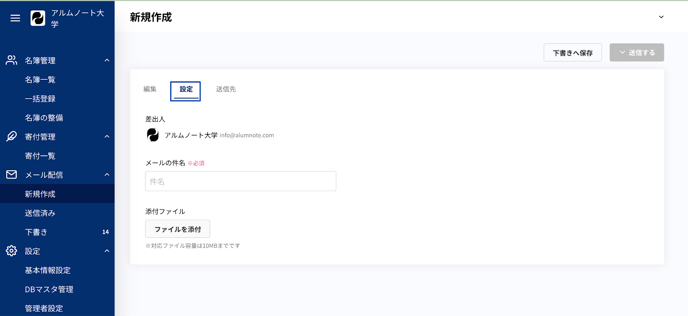 • メール新規作成画面にて、右上の “下書きへ保存” ボタンを押して保存する