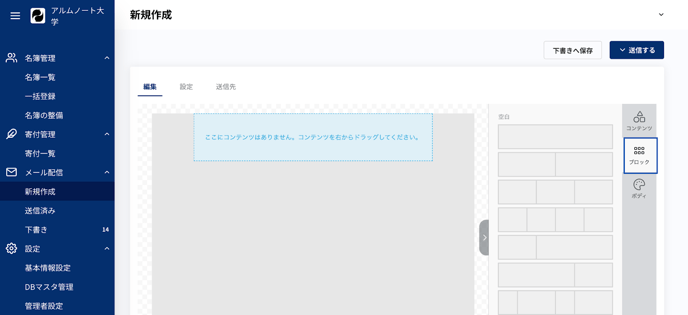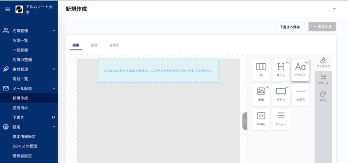 • 本文入力フィールドは、2枚目の画像の “ここにコンテンツはありません。コンテンツを右からドラッグしてください。” と表示されている部分