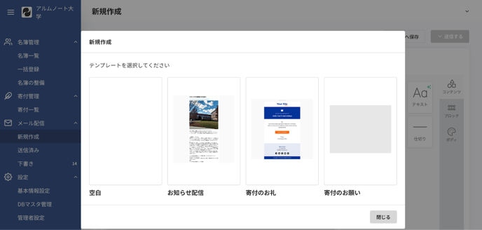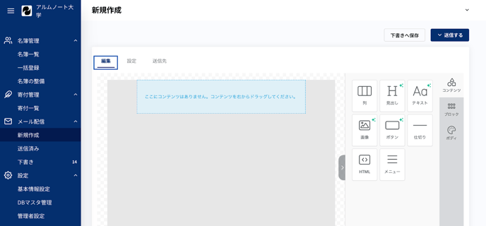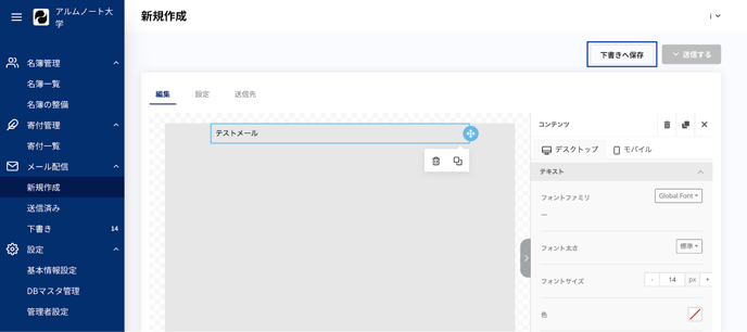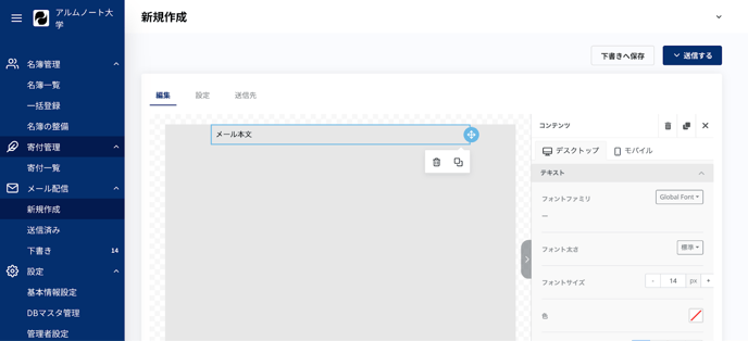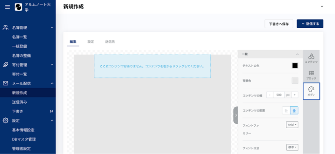 • テキストの色や背景色・コンテンツの幅等、メールの見た目に関する調整はこの画面から行う