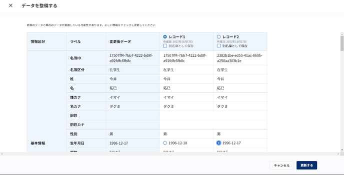 • 別のレコードの値を使いたい名簿項目がある場合、その値のラジオボタンをクリックして変更後データに設定する