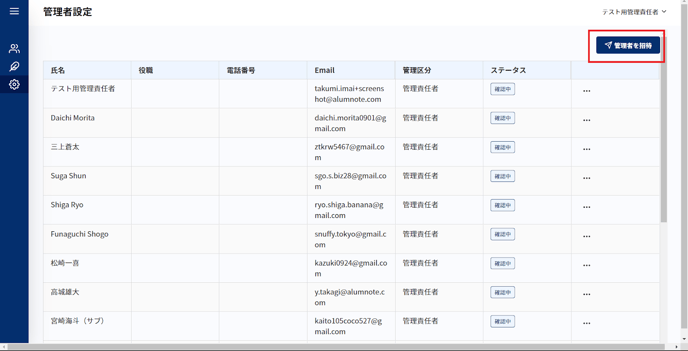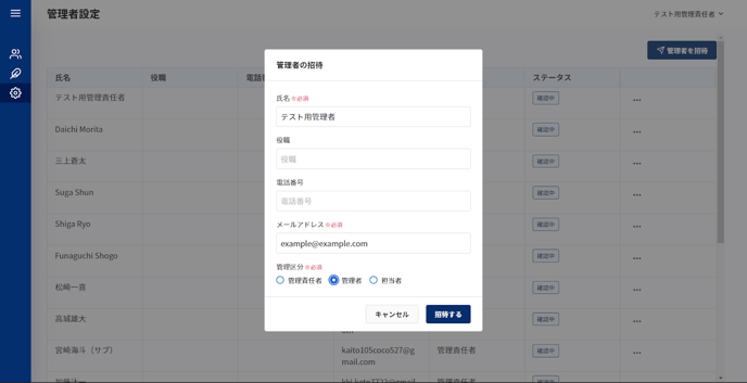 • 管理者を招待ボタンをクリックしてモーダルを開く