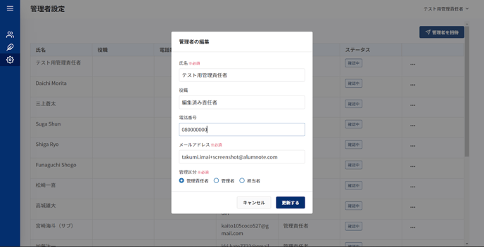 • メニューの”編集”項目をクリックして管理者の編集モーダルを開く