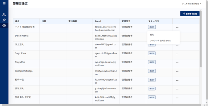 • 失効させたい管理者の行の右端の3点リーダーボタンをクリックしてメニューを開く