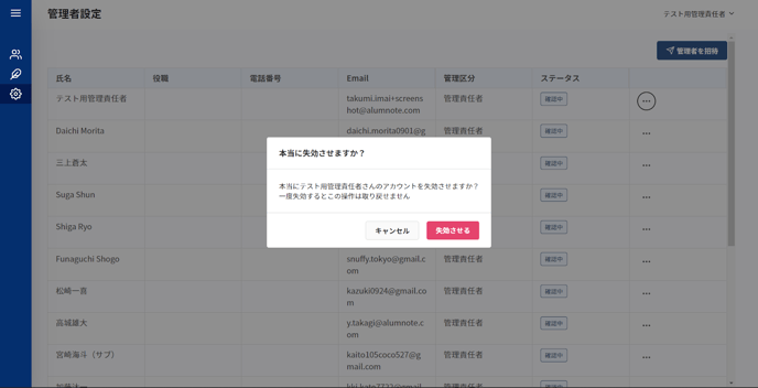 • モーダルの”失効させる”ボタン(赤色)をクリックして名簿管理システムのアカウントを失効させる