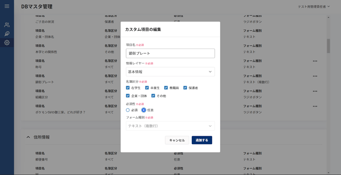 - 名簿追加・編集画面において、今回追加する項目はここで選択した形式の入力フォームで表示・記録される