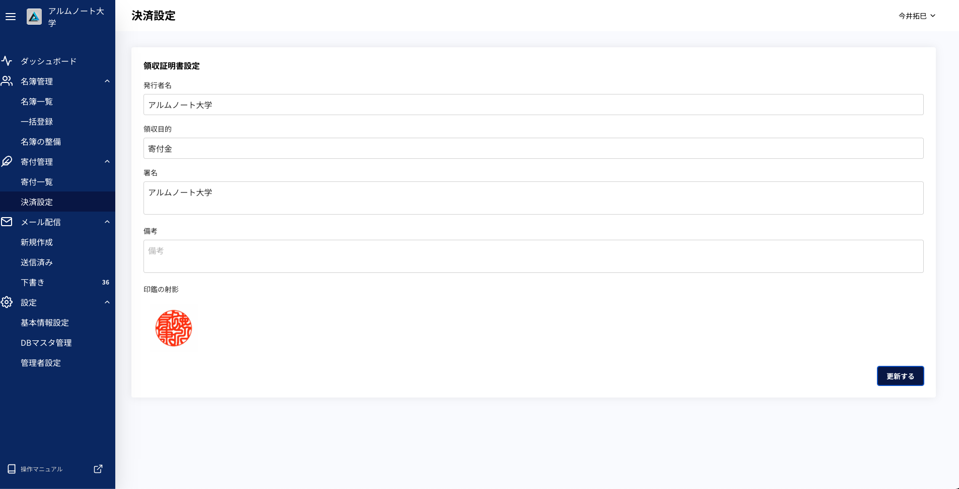 - 署名: 印鑑射影の左に表示される文字列です。領収書の発行者として指定する団体・個人名を入力してください。